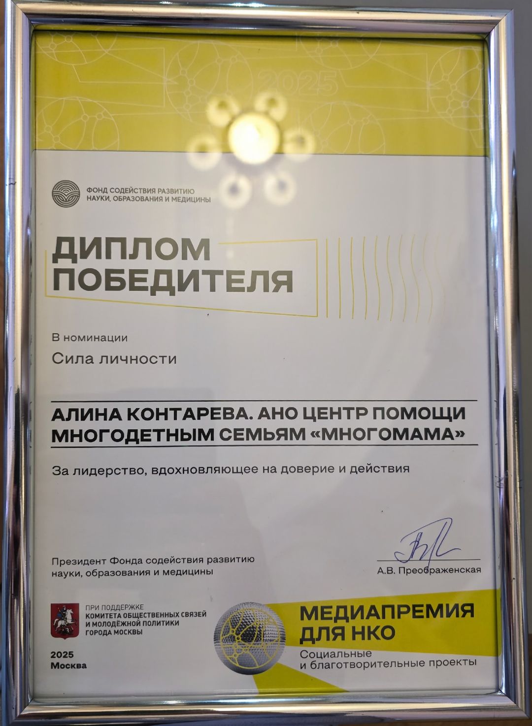 Основатель и президент АНО Центра помощи многодетным семьям "МногоМама" (организация создана в 2014г.) - крупнейшей федеральной благотворительной организации, опекающей более 175 тыс.многодетных семей по всей России, более 75 тыс.из них - в Москве и Московской области.