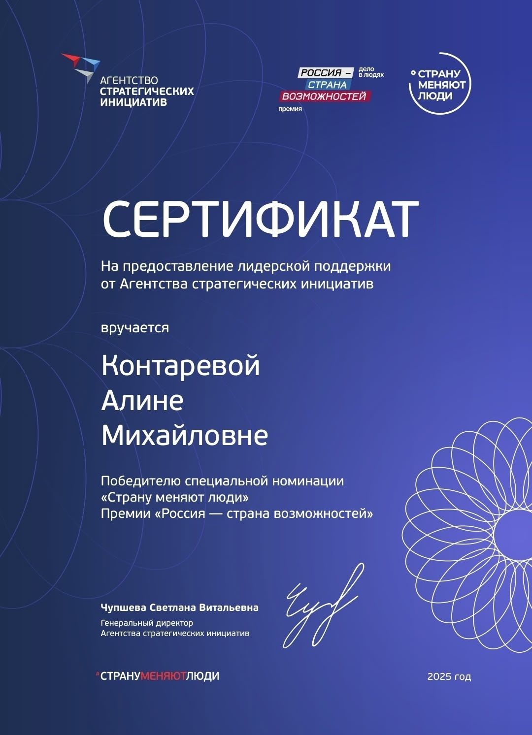 Входит в 25 социальных лидеров проекта "Удивительные люди" по мнению издательства Аргументы и Факты.