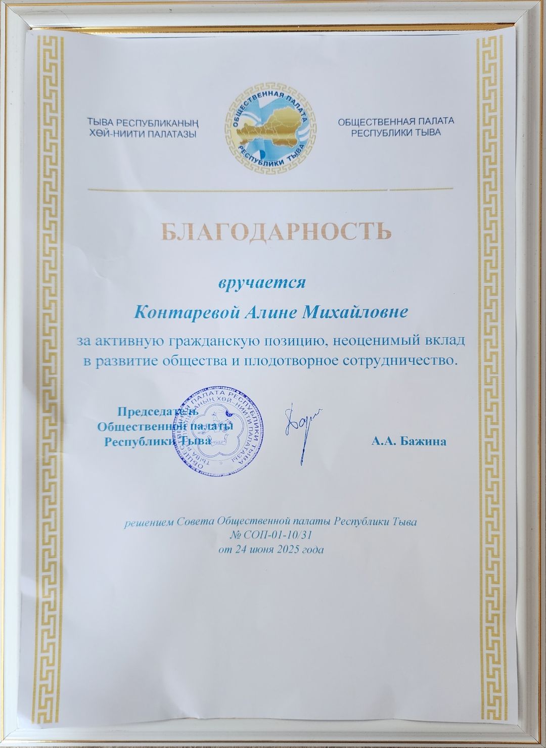 Награждена Петровской Грамотой от Общероссийского Общественного Движения "Россия Православная" за сохранение традиций, милосердия и благотворительности.